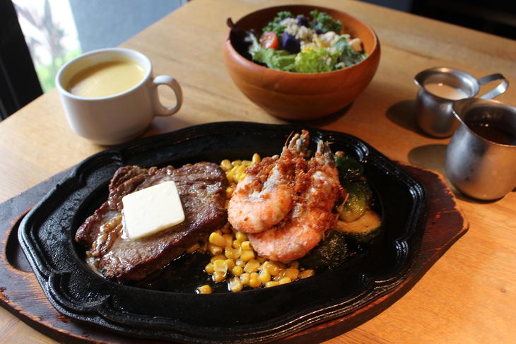 ランチ用の小ぶりのリブアイステーキ(110gほど)にガーリクシュリンプが2尾ついたリブアイステーキ&ガーリックシュリンプのコンボ。サイドには、ライスかミニサラダかコーンスープかガーデンサラダなどを選べます。マウイ産オニオンのステーキソースがお肉の味を邪魔せず、お肉の味をじっくり味わうことができます。