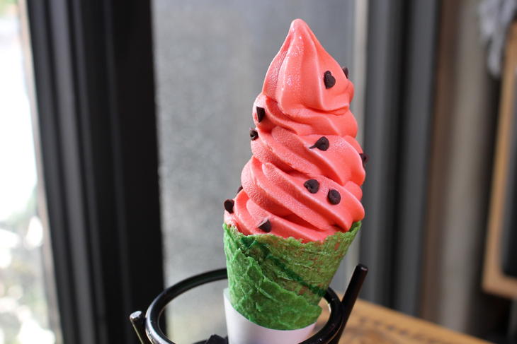 最後は、アロハステーキハウスのシグネチャーデザートのスイカソフトクリーム。見かけはスイカ、お味もスイカ。目をつぶって食べたらスイカそのものです。
