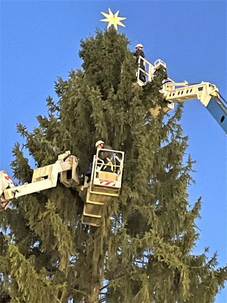 ↑ モミの木の幹の太さが、普通の人のお腹くらいの幅があります。右側にあるクレーンがとても小さく感じられますが、道路工事などに使われるものよりは、ずっと大きなサイズのクレーンです。今男性が、飾り付けのためにクレーンに乗ってゆっくりと上がっていくところです。