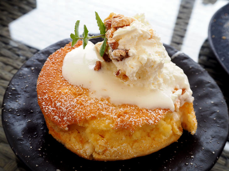 写真に撮ると小ぶりのパンケーキがふたつ、生クリームがたっぷりのったように見えますが、ふたりでシェアしてもメッチャ、ボリュームがありました。