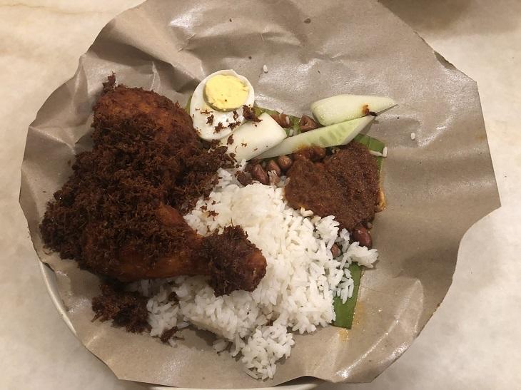 ナシレマはマレーシアの代表料理で、ココナッツミルクで炊いたご飯とサンバルソース(辛味ソース)を混ぜて食べます。ほかにゆで卵、ikan bilis(小魚の素揚げ)、ピーナッツ、きゅうりも一緒にのっています。