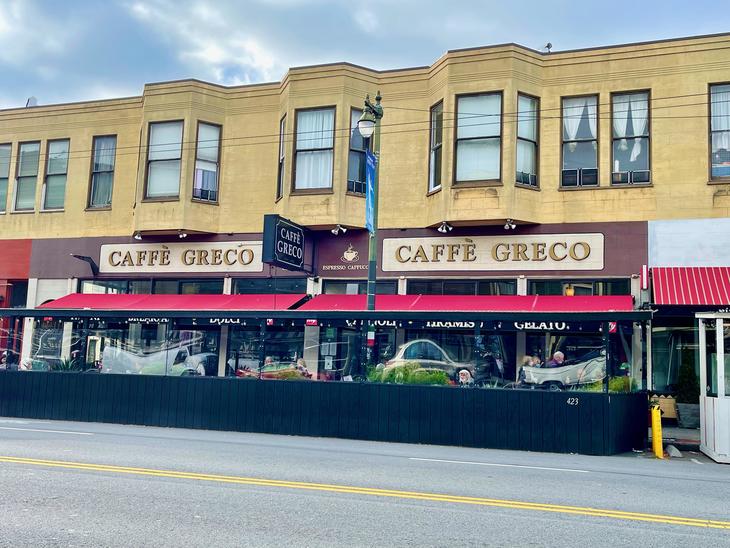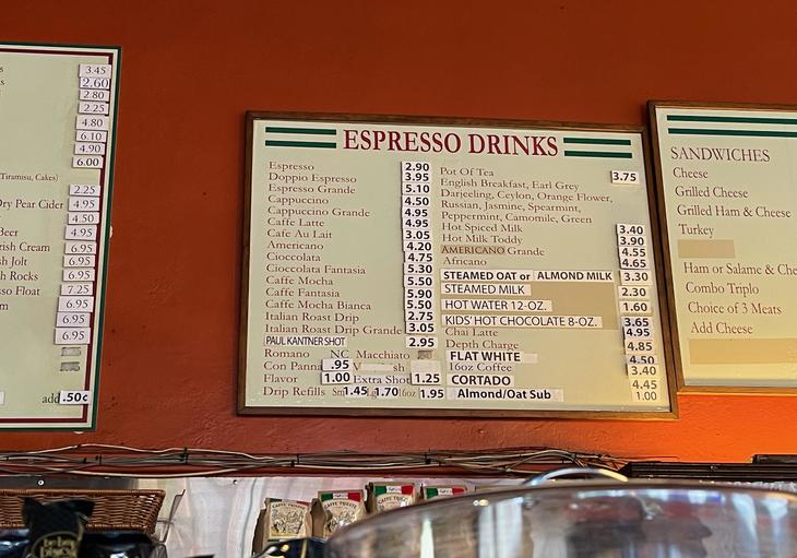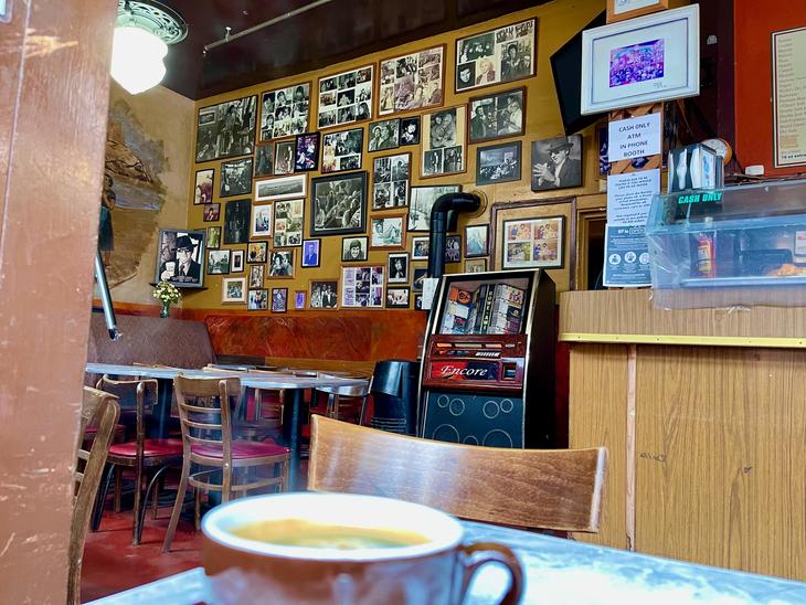 トリエステは現金のみ、ただ店内にATMがあります。お店の隣はコーヒー器具やビーンズが売っているショップです。賑やかなコロンバス通りからちょっと入った静かな場所です。私が訪れたとき、お財布を忘れたかで現金を持っていなかったオバちゃまがいました。レジのお兄ちゃんが「毎週来てるのだから今度払ってくれればいいよ」と何事もなかったかのようにコーヒーを差し出したんです。その光景にびっくりしましたが、テーブルにコーヒーを置いてすぐさまお手洗いに……場所を知ってるんだから常連さんだって思いました。店内には古い写真がいっぱいあります。スマホをいじっているのが恥ずかしくなるくらい新聞・雑誌を読んでいる人が圧倒的に多いカフェです。