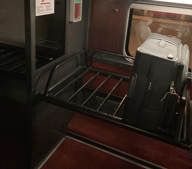 頭上にも荷物をのせる場所があります。席の番号がついているのでここで自分の席を確認します。