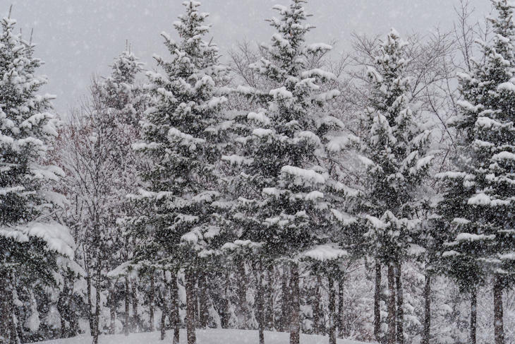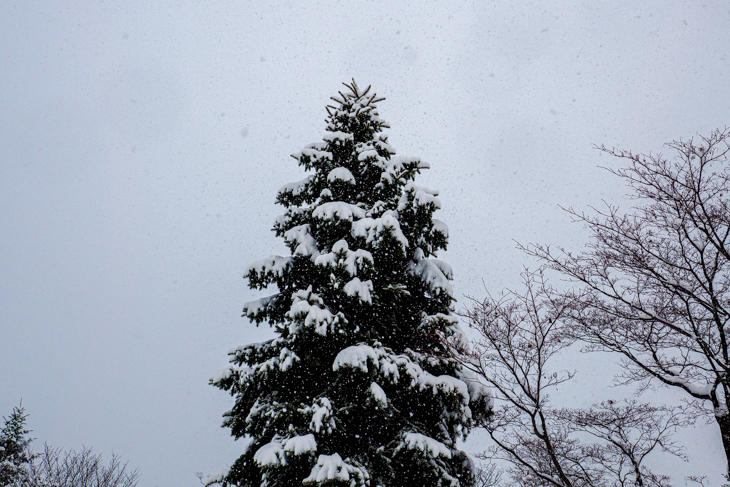雪が降り始めの時期は、気温が高めで水分を多く含んだ「ぼたん雪」が降ることも多いのですが、この日は気温がマイナスで寒かったので、粒が小さい軽めの雪がしんしんと降っています。