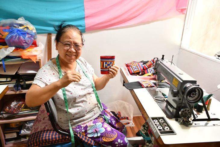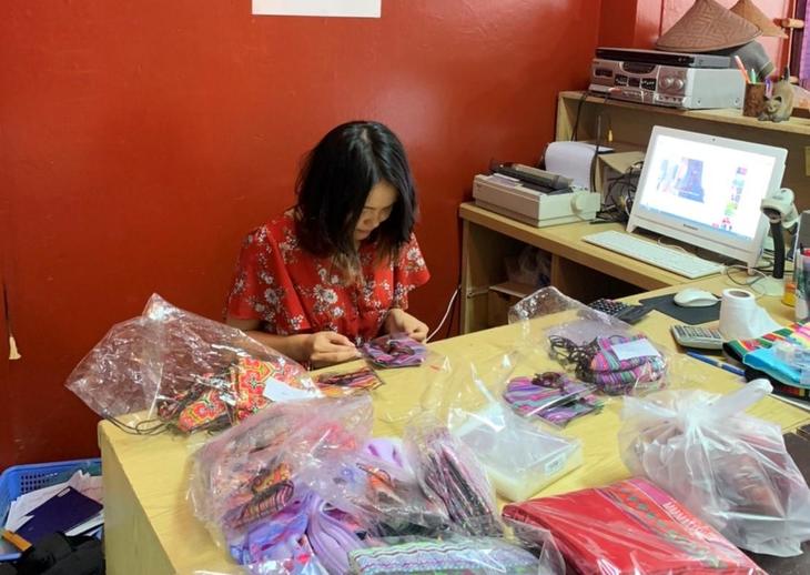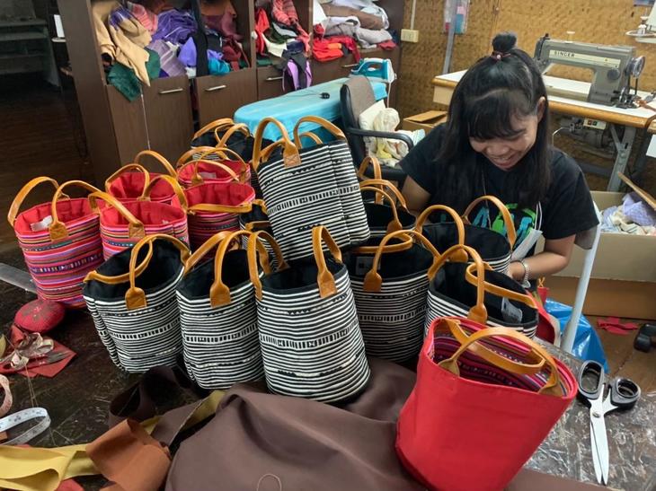 商品のオーダーを受けたら、まず山の上に暮らす山岳民族たちに「注文が入ったよ~」と発注をかけます。彼らには、機織りや刺繍、染めなど、伝統技術が必要になる肝のパートだけお願いします。できあがったものが山から届いたら、今度はチェンマイの街中で暮らす山岳民族出身者の自宅に配って、各家庭で仕上げをしてもらいます。