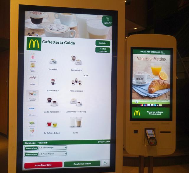 ↑ こちらは、また別のマクドナルドです。ブリオッシュなども、普通のイタリアのバールと同じ品質のものです。駅前にあるマクドナルドは、列車の出発前に朝食を楽しむイタリア人や、ツーリストの姿が見られます。