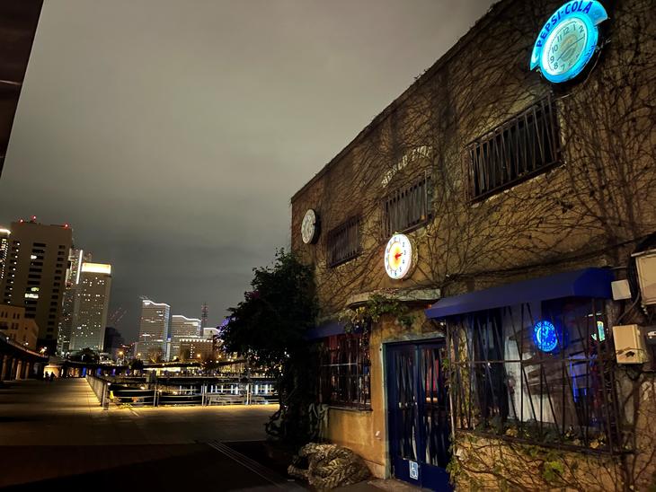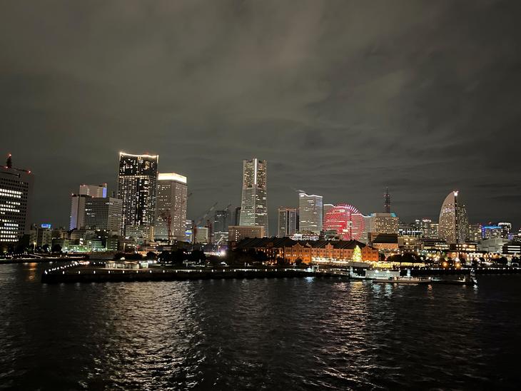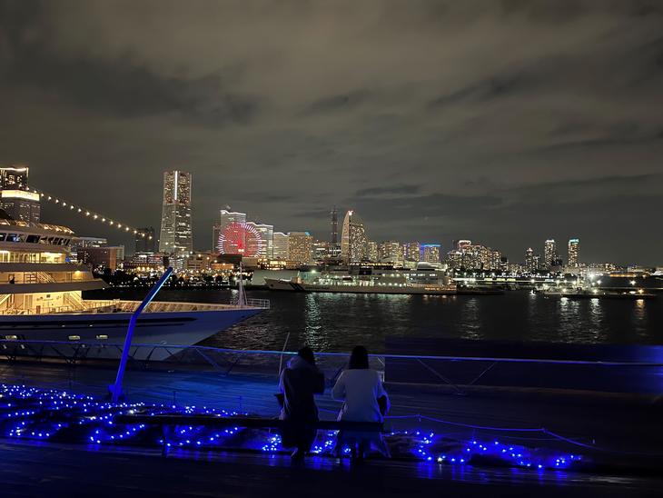 ベンチに座ると向こうにはみなとみらいの夜景が。