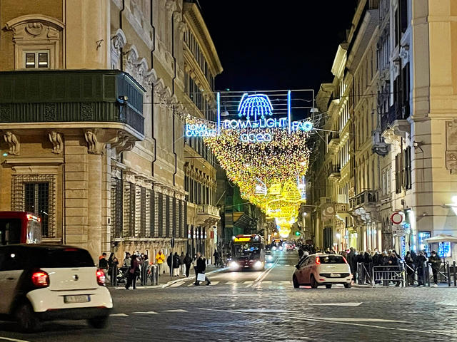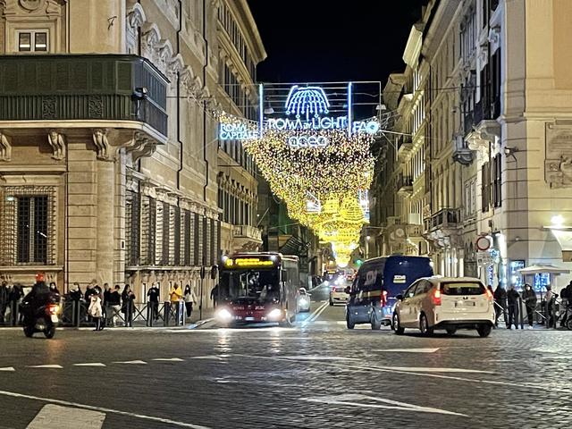 ↑ ヴェネツィア広場とポポロ広場を結ぶ目抜き通り、コルソ通りのイルミネーションです。延々と続く黄金の川が圧巻です。今年は、ローマ市、ACEA(電力・水道会社)にFAO(国連食糧農業機関)がスポンサーとして協力しているのが見えます。写真の奥の突き当りにポポロ広場があります。