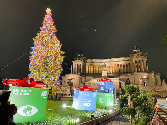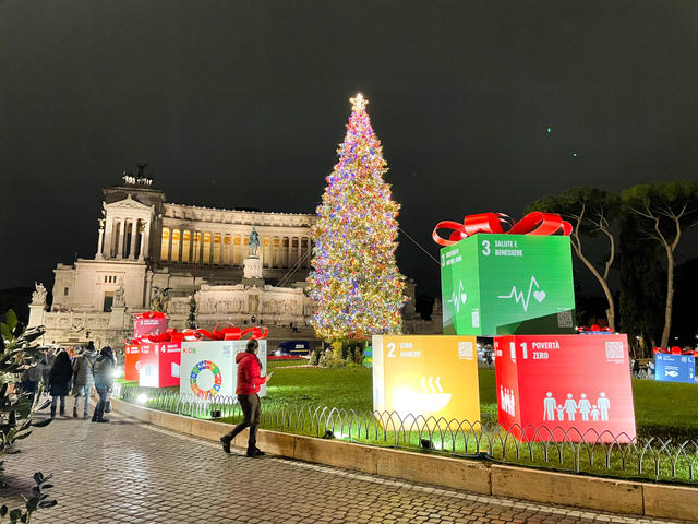 ↑ この2021年の目新しさは、国連国際機関が目標に掲げている"持続可能な開発目標"を象徴する17の巨大なプレゼント型のメッセージがツリーの下に置かれていることです。遠目で見ると何の装飾なのかよくわかりませんでしたが、かわいいプレゼントの箱でした。