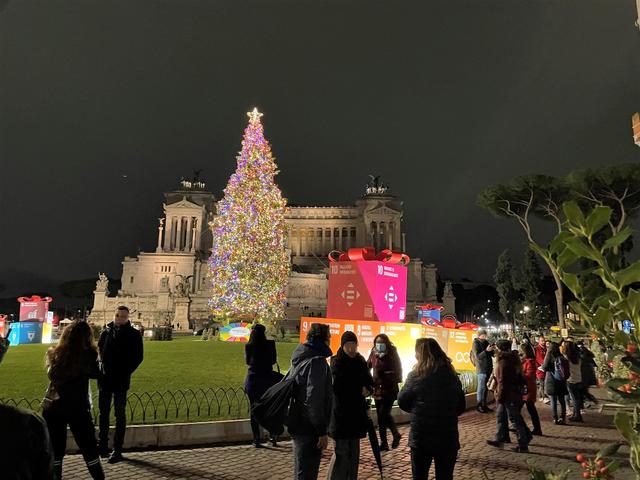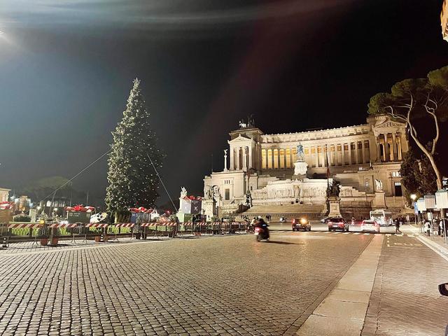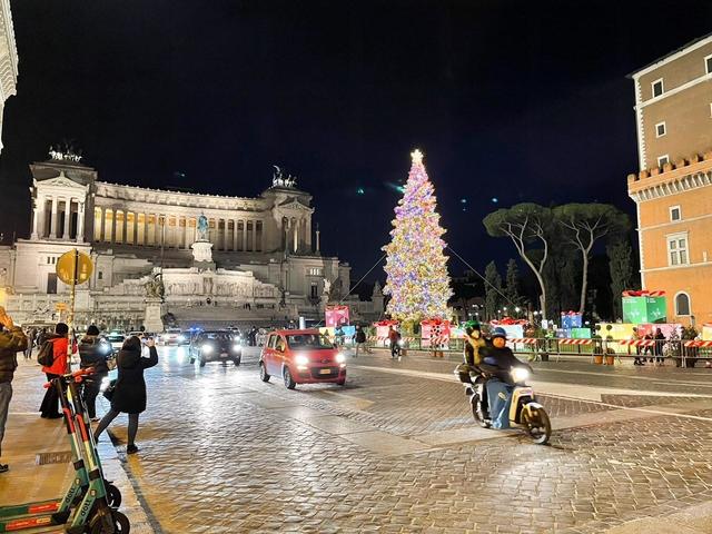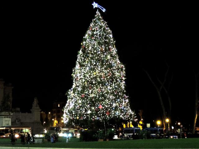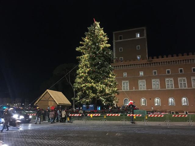 前回より、ローマのクリスマスイルミネーションの様子をお届けしています。昨年は、クリスマス直前にロックダウンに入ってしまったため、クリスマスを外で楽しむなどという余裕はまったくなく、道に出たらそれこそ鞭で打たれそうでしたが、今年2021年は、昨年のクリスマスイルミネーションの分も町はきらびやかに輝きを放っています。ローマで、クリスマスのイルミネーションでおさえたい場所は数ヵ所あります。今回は、ヴェネツィア広場のクリスマスツリーです。