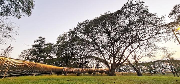 ベンジャキティ公園の北西部分に新しく造成されたベンジャキティ森林公園は、自分が今居るのはバンコクではないのではないか!? と感じる別世界です。公園内の樹木の背丈は低めで、日差しが強い時は暑く感じますが、季節や時間帯によって植物の色や空の色が変わり、多くの人が思い思いに時間を過ごせる、バンコク市民の憩いの場です。以前来た時は、日中あまり人がおらず夜の治安が心配でしたが、夜は橋と通路がライトアップされ、昼間とはまた異なる美しさがあります。