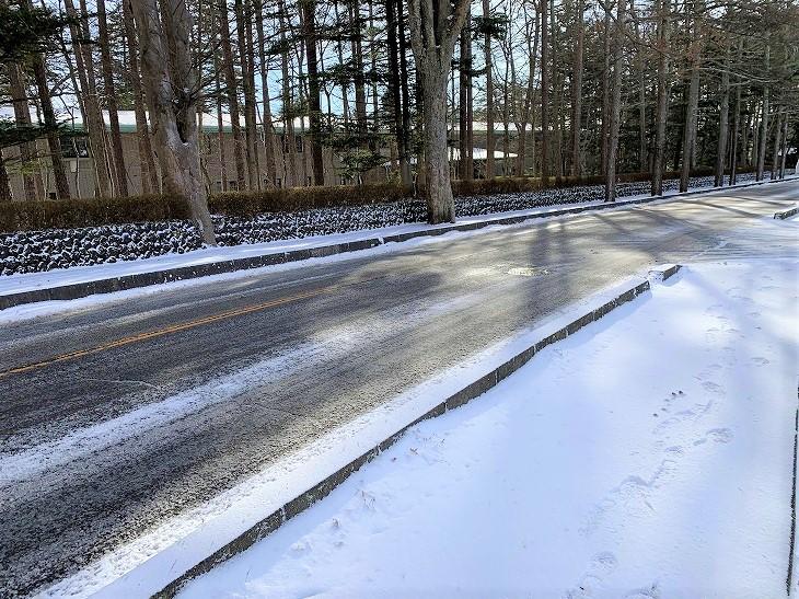 大きな道路は雪もなく路面が見えていますが、こんな時は注意が必要です。道路が見えていますが、この気温なのでカチコチに凍っています。急発進、急ブレーキをするとスタッドレスタイヤの4WDでも滑るので軽井沢にお越しの方は気を付けてください。ノーマルタイヤの方は絶対に車に乗らないでくださいね。今朝も車の事故がありました。安全に冬の軽井沢をお楽しみください。