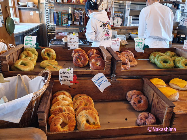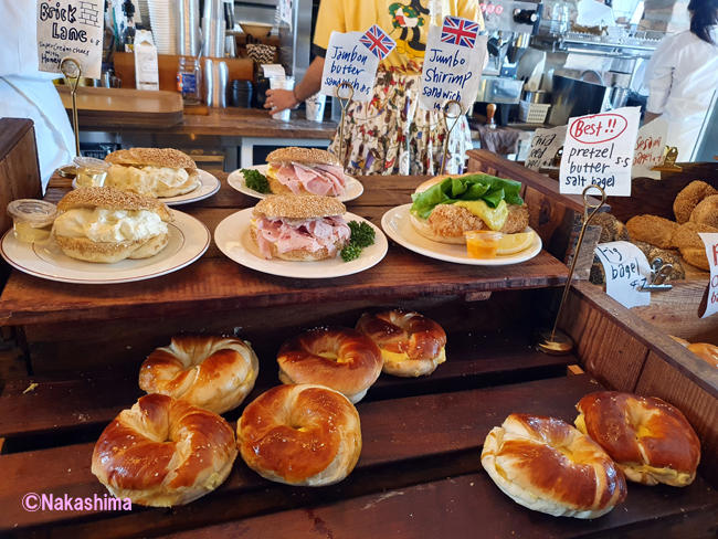 たくさんの種類のベーグルを見てると、どれも食べてみたくなります。