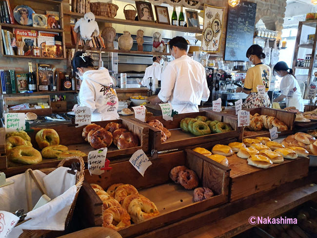 入口の左側にはカウンターがあり、その前には種類豊富なベーグルがたくさん並んでいます。