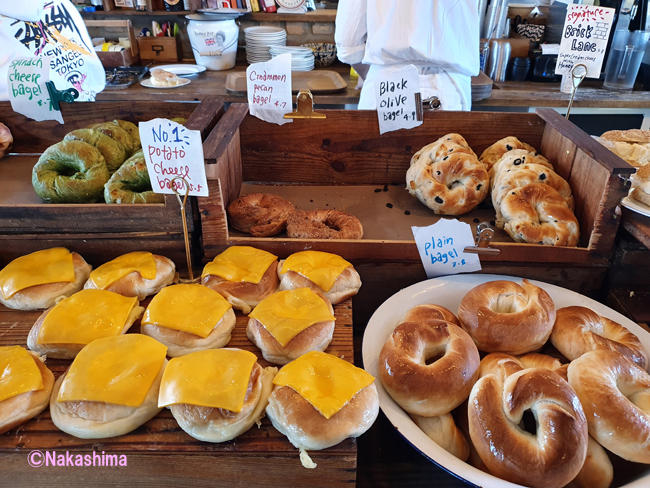 横にはプレーンベーグル、後ろにはホウレンソチーズベーグルやシナモンピーカンベーグルやブラックオリーブベーグルなども並んでいます。