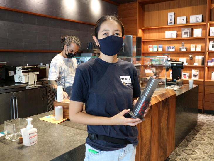 コナコーヒー・パーべイヤーズのイカワ・トワさんは、2019年全米エアロプレス優勝者の日本人バリスタ。どんなコーヒーが好きなのか、砂糖やミルクは入れるのかなどを伝えると、好みのコーヒーを入れてもらえます。自称「コーヒーオタク」のトワさんは、エアロプレスのことやコナコーヒーはもちろんコーヒー全般に見識が深いので、ぜひお話ししてみてください。