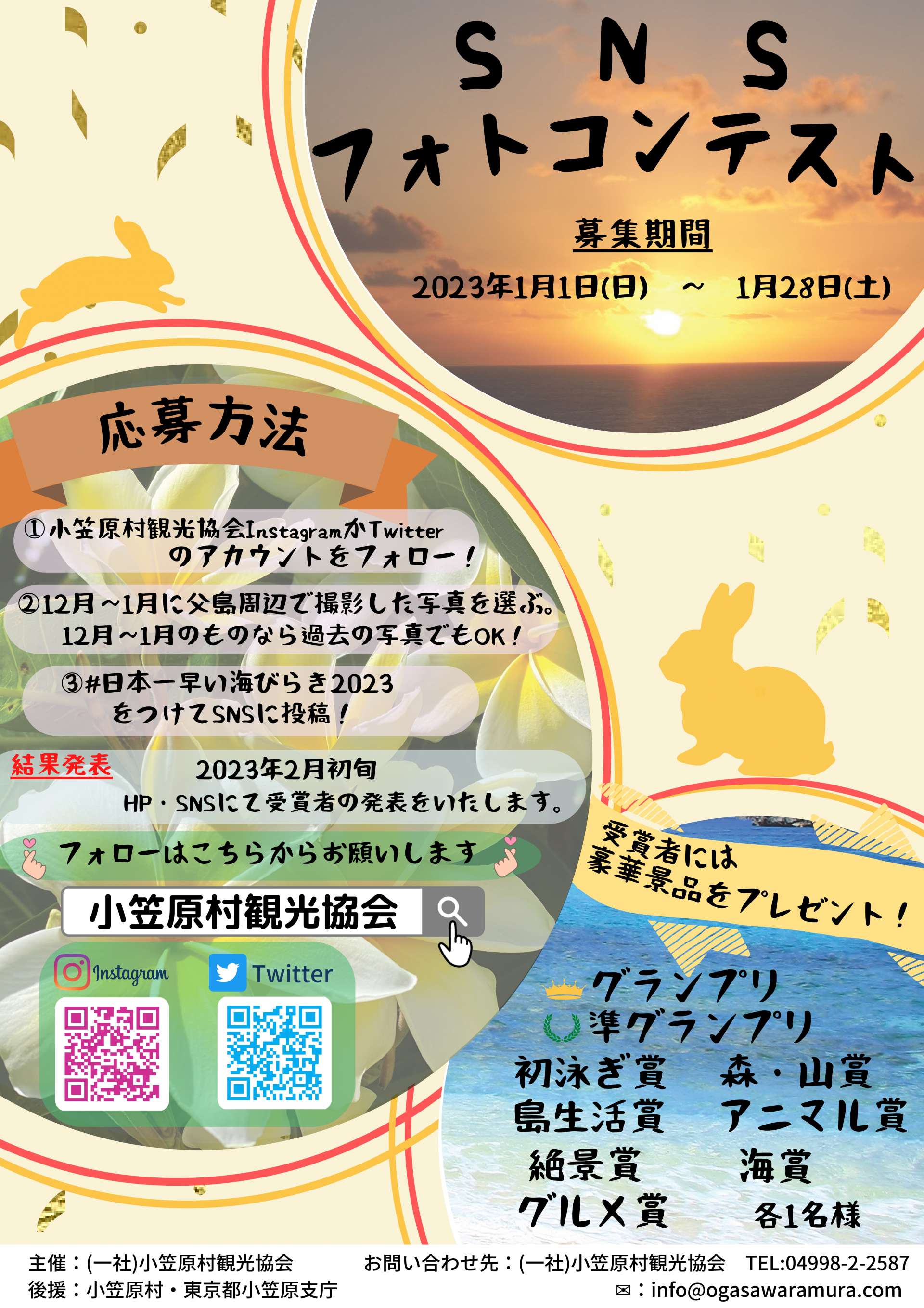 12月~1月に父島などで撮影した写真であれば過去のものでも応募ができるフォトコンテストです。入賞者には豪華景品が用意されているそうなのでお持ちの方は応募してみてはいかがでしょうか?