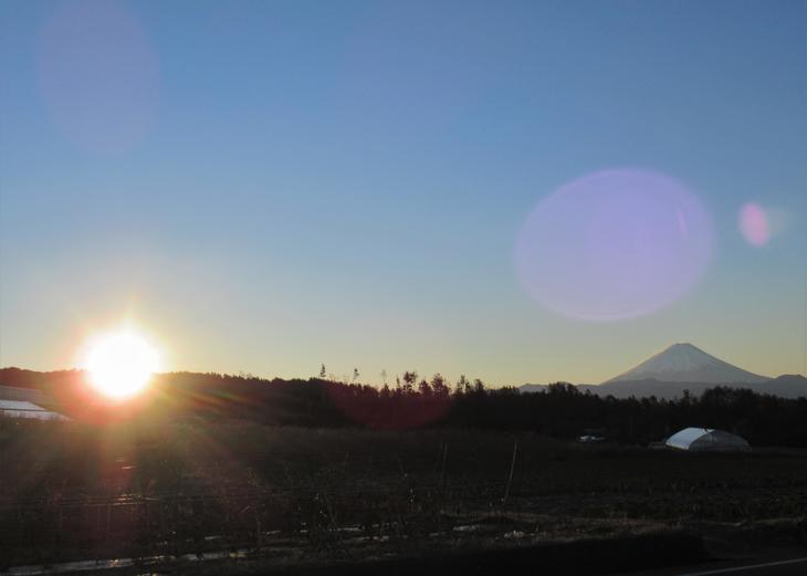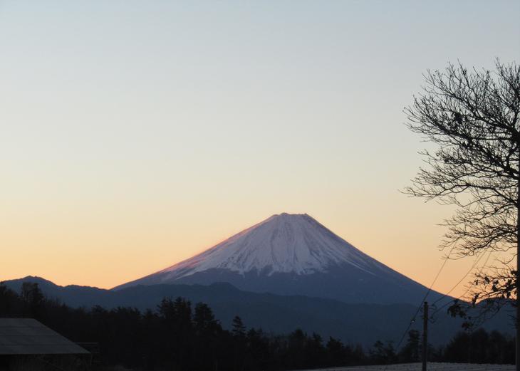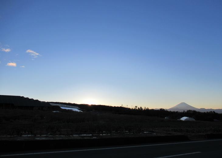 上の写真は、山梨県北杜市明野町の「あけの農さん物販売所」向かい側の駐車場から見た2022年元旦の日の出前、朝6時52分の富士山です。