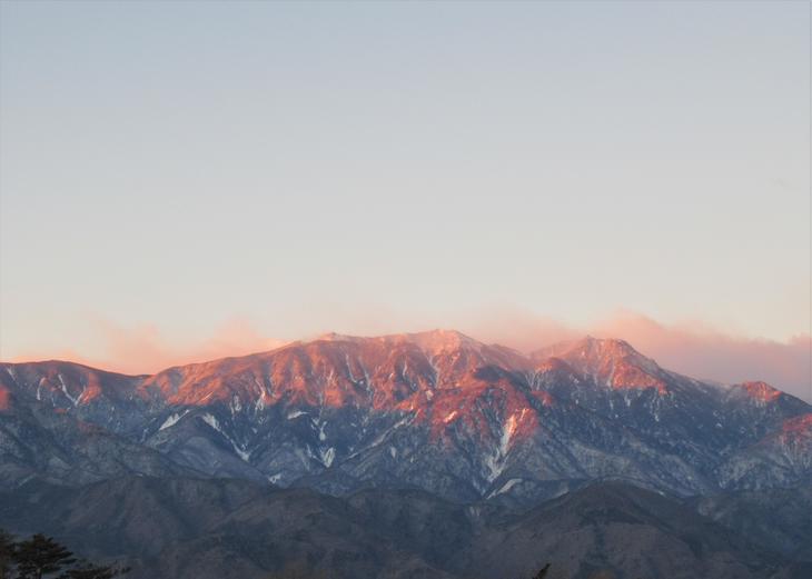 西側にそびえる南アルプス連峰鳳凰三山も、赤く染まっていますね。気温はマイナス4度でした。手足の感覚がなくなるような寒さです。