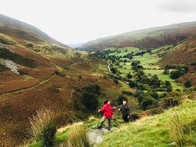 高台から谷間の村スランライアドル・イム・モナハント(Llanrhaeadr-ym-Mochnant)方向を望む景観。