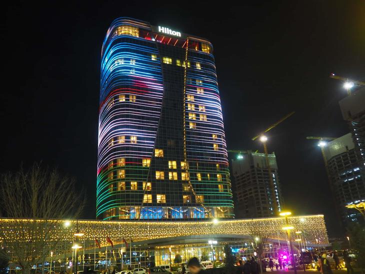 ヒルトン・タシケントシティ(ヒルトンタシケントの表記も)は、近年開発されている複合施設タシケントシティのなかにあります。高級マンションや公園などさまざまな施設があるタシケントシティ(他の施設についてはこちらの記事もご覧ください:52. タシケントの今を象徴する複合施設タシケントシティ。夜の噴水ショーは必見!)ですが、そのシンボルがこのヒルトン。21階建ての建物はかなりの迫力があります。しかも夜になると国旗カラーなどにライトアップ。