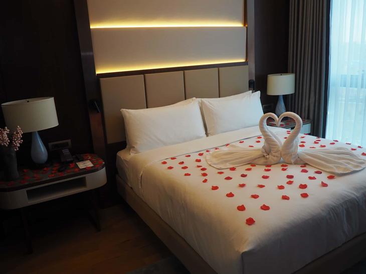 入ってみるとなんとびっくり、テレビの前には花束。そしてテーブルには一面の花びらとシャンパン、スタッフ直筆のお手紙が。さらにベッドの上には嬉しすぎるタオルアート。
