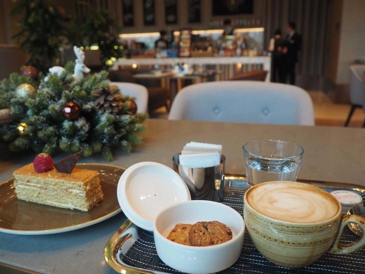 まずはドンと構えて優雅にシャンパンをいただくのがヒルトンにふわさしい過ごし方なのでしょうが、貧乏性な性格なので宿泊代の元を取らないと…とホテル内をいろいろ探検してみます。まずは1階レセププション横のカフェレストラン、ロビーラウンジへ。カプチーノ(4万5000スム:2022年1月現在のレートで約450円)とケーキ(6万スム)をいただきます。