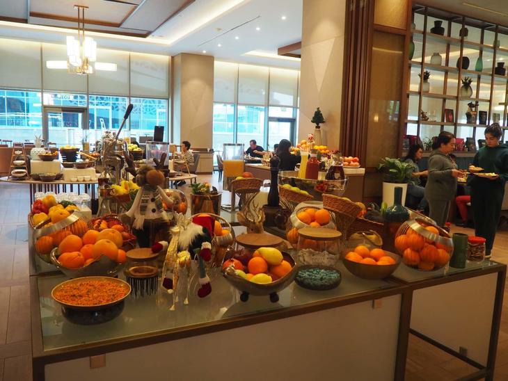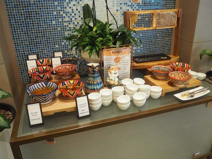 さすがヒルトン! と感心する種類の多さでしたが、サモサや地元産はちみつ、ドライフルーツなどウズベキスタンらしい料理や食材もありました。ウズベク陶器やウズベクおじさん人形もところどころに飾られていてナイス!
