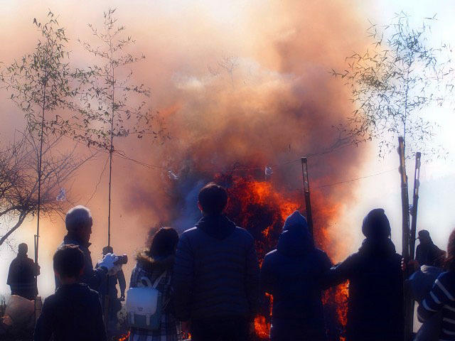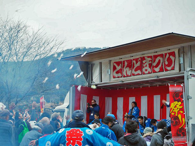 すっかり燃え尽きたら、お楽しみの餅投げが締めで、ついつい最後まで見届けてしまいます。
