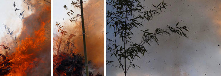 炎が燃え盛るのを眺める人々の手には竹が握られています。