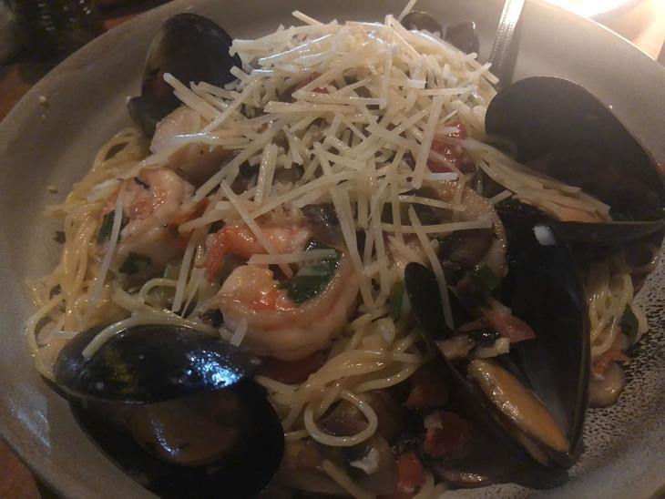 ステーキなどもありますがやはりメインはシーフードとのことで、シュリンプカクテルや魚介のパスタを注文しました。