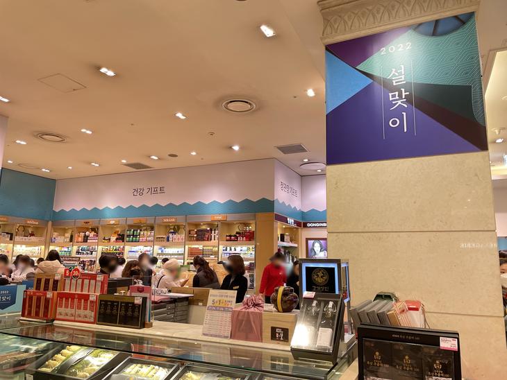 高速バスターミナルの中にある新世界百貨店の贈り物売場は旧正月前のため、多くの人でごった返していました。