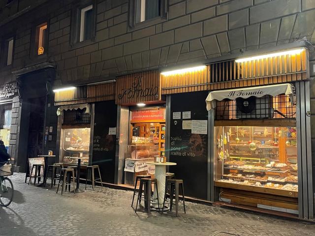 ↑ 先日、日が落ちて少し暗くなってから、ローマのカンポ・デ・フィオーリ広場の前を通りました。こちらは、目抜き通りヴィットリオ・エマヌエーレ2世通り側から広場に入る時にすぐ左側にある有名なパンとお菓子屋さん「イル・フォルナイオ」です。ベーカリーですので、朝の4時から深夜0時まで営業しています。遠くからでもおいしそうなものがたくさん見えますので、近づいてみたいと思います!