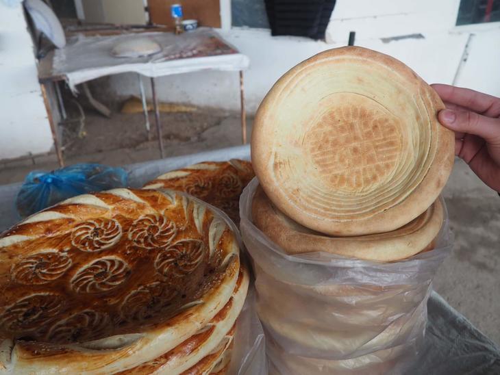 というわけでさっそくナン売り場へ。どのナンも大きく、しかも模様の美しいこと! ウズベク人の主食である平たいパン、ナンはどこでも同じ形なのかと思いきや、実は町や地域によって味や形が違う興味深い食べ物なのです。確かに人の顔より大きそうなこんなナン、タシケントではなかなかお目にかかれません。