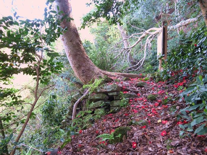 「羽衣の池」近くに大きな椿の木があるのですが、倒れそうな大きな椿の木を人工的に積み上げられた石で支えてる姿を見てジブリっぽいと感動しながら、椿が落ちて真っ赤な絨毯っぽく染まり自然が魅せる幻想的世界をしばし見入りました。それでは、また手足を使って元のルートに戻り山頂を目指します。