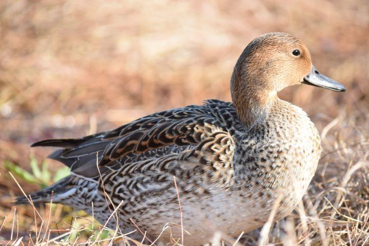 陸に上がっているオナガガモ。餌づけをしている人がいるために人に慣れているようで、かなり近くまで寄ってきます。観察するにはうれしいのですが、野生の生き物に餌をあげるのはやめましょう。人間が餌を与えると楽に餌をもらうことに慣れてしまい、自然で生きることができなくなったり、人間に食べ物をねだるようになったりします。