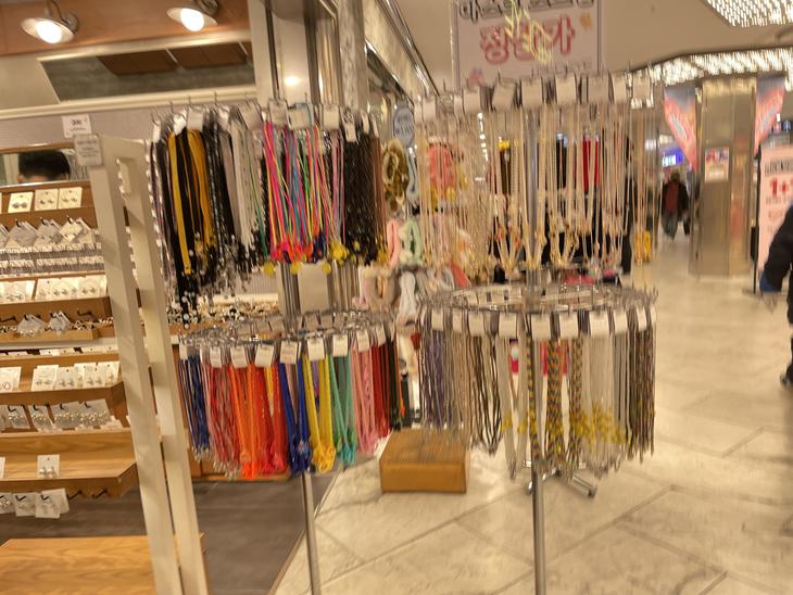 マスクで顔が隠れ、メイクができないためかおしゃれなマスクストラップが町なかのお店で売られていました。