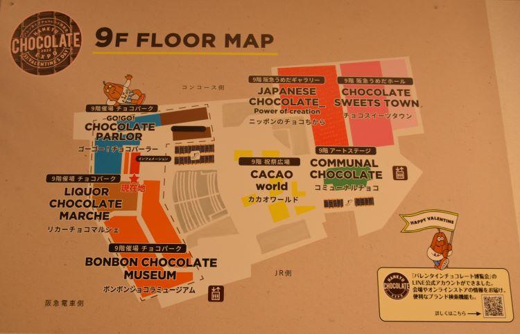 会期中盤、月曜日の午前中に訪れたので、人は少なめでした。4年連続で行っていますが、コロナウイルスの急拡大で外出を控えている人も多いためか、今まででいちばん人が少なかったです。オンラインストアを充実させたり、事前予約を取り入れたりと、なるべく人が密にならないようにと百貨店側も工夫をしています。いつもはたくさんのお店で行列ができているのですが、今回はあまり並ばず、快適に買い物をすることができました。メインの会場となる9階のマップです。9階だけではなく、各階にバレンタインチョコレートコーナーが作られているので、そちらもぜひチェックしてくださいね。
