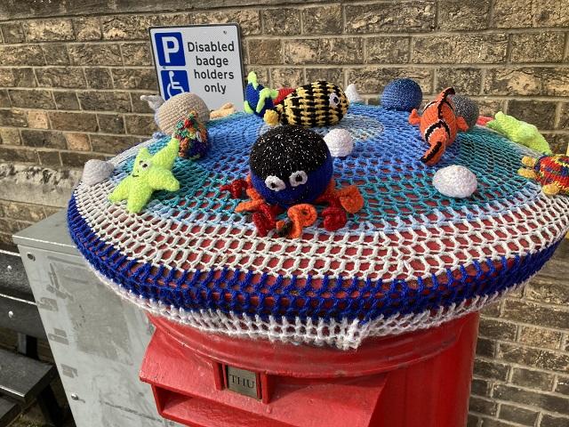 カラフルな帽子をかぶった郵便ポストに、ほっこり可愛い編みぐるみ達。コロナ禍で沈みがちだった町の人びとに笑顔を! という、編んだ人の暖かい気持ちが作品から伝わってきます。