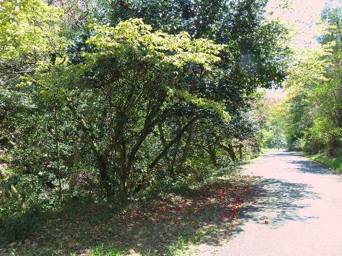 季節的なこともあるんでしょうが、羽衣石→十万寺を歩いているとよく椿を見かけました。「荒神社(こうじんやしろ)」を後にしてすぐのところにある「鮎返りの滝」にも目印のように椿が落ちていましたよ。