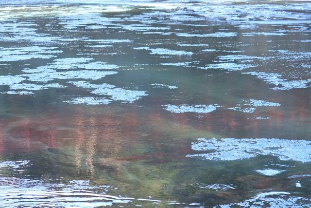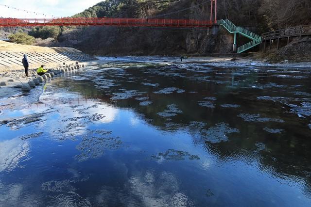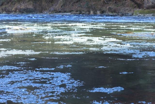 厳しく冷え込んだ早朝限定の自然現象で、川面をシャーベット状の薄い氷が流れます。