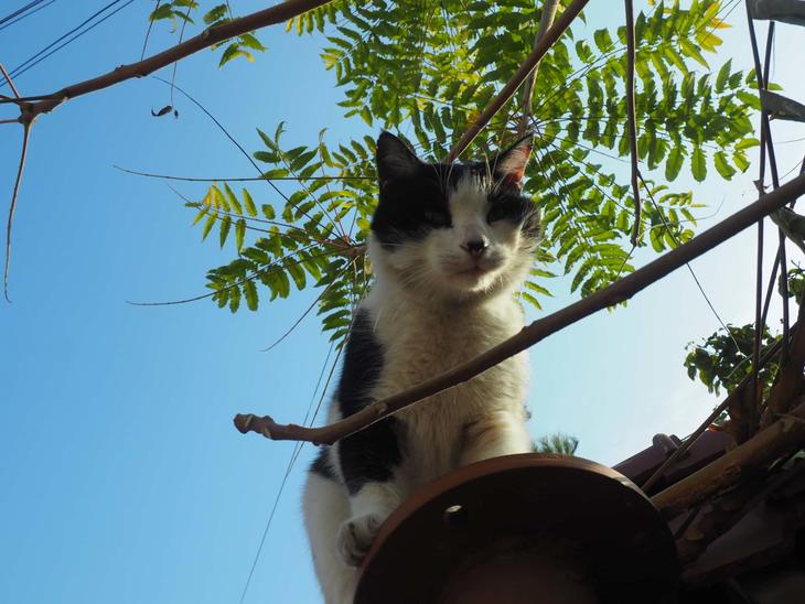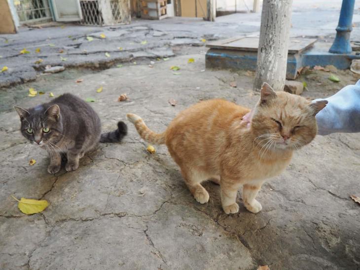 日本の野良猫と比べると、こちらを見ると逃げるどころか鳴きながら近づいてくるほど人懐っこいこと、そしてまるまる太った……もとい、恰幅のいい猫が多いことが特徴といえるでしょう。野良猫はほとんど必ず誰かに餌をもらっているので、あまり人を怖がらないのです。というわけでこんなアップ写真を撮ったり、撫で撫でしたりするのも簡単です(言うまでもありませんが触った後はしっかり手を洗いましょう)。もちろんすぐに逃げてしまう怖がりな猫もいますが……。