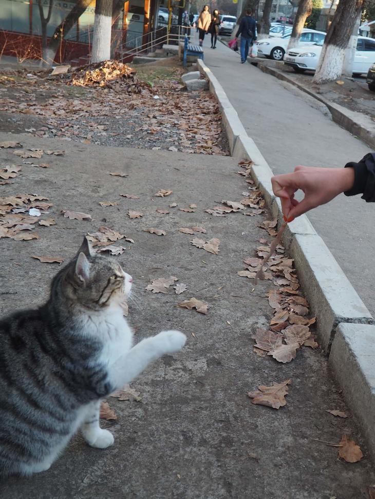 特に集合住宅では、住人が猫を世話しているのが当たり前のよう。飼い猫ではありませんが完全な野良猫でもなく、地域猫や半野良猫と言うべきでしょうか。ウズベク人はお客を家に呼ぶと大量のご飯を振舞うという習慣がありますが、それは動物にも適用されるようで、猫もおなかいっぱい食べさせてもらっているようです。餌付けが禁止されていることが多い日本の野良猫の現状とどちらがいいのか一概には言えませんが、少なくとも猫にとっては何もしなくてもご飯に困らず、天国のような環境でしょう。