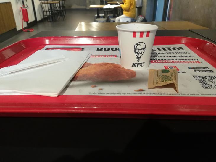 いつも乗り換えのときに時間が合えばボローニャ駅構内にありますケンタッキー・フライド・チキンを食べることが道中唯一の楽しみなんです。