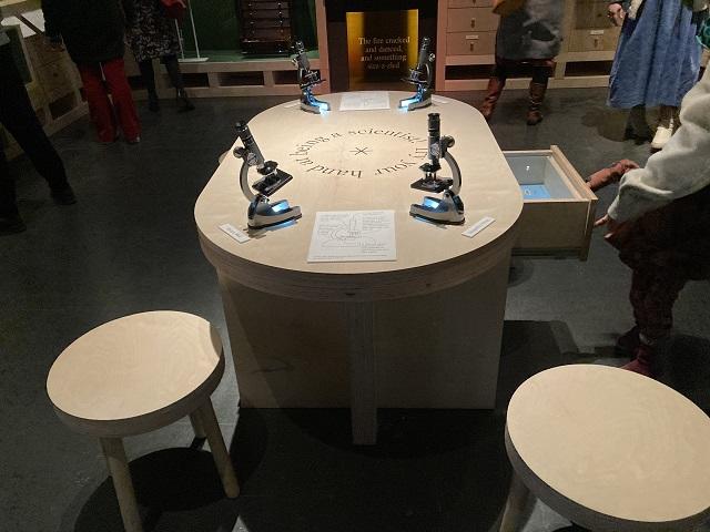 顕微鏡で観察して蝶の羽根などの詳細な絵もたくさん描いており、会場にはその疑似体験ができるテーブルも用意されています。
