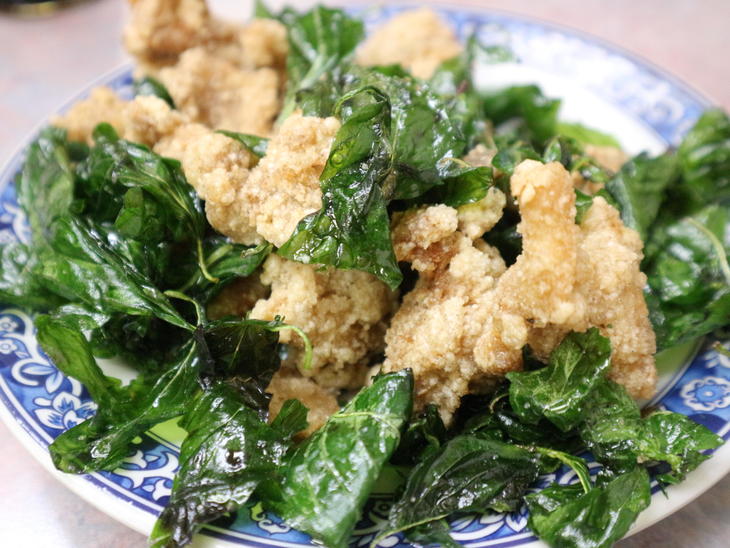 ▲タイワニーズ・ポップコーン・チキン:外はカリカリで中はジューシーなチキンです。台湾スタイルの鶏の唐揚げはバジルが一緒に出てきます。パリパリとしたバジルの食感と独特の香りが唐揚げによく合います