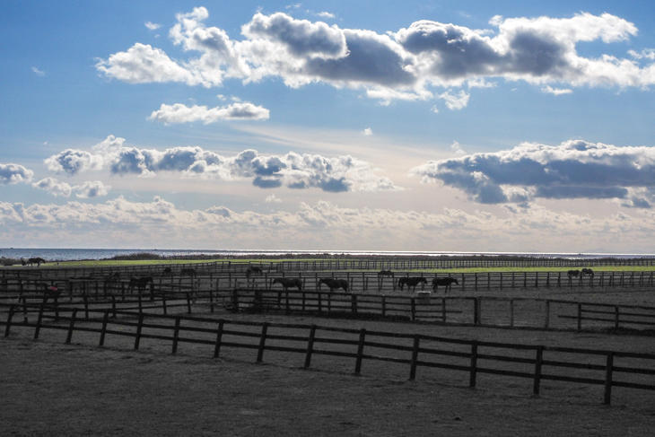 苫小牧方面から国道235号線を進み白老町へ入ると間もなく、道路の両サイドに牧場があります。