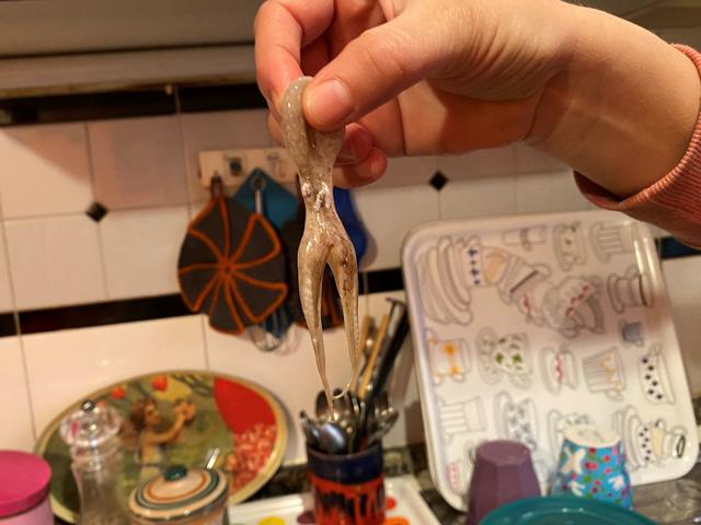 ↑ このような小さなタコを購入しました。「タコのサンタ・ルチア風」は、ナポリのサンタ・ルチア湾からきています。ナポリのあるカンパニア州の伝統的な料理で、そのレシピは古代に起源を持っています。昔ながらの調理法では、タコは陶器の入れ物で煮て出されるのですが、普通の鍋や圧力鍋でも作ることができます。筆者達は、深さのあるフライパンで作りました。
