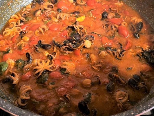 ↑ 作り方は簡単です。ひと言でまとめますと、先に鍋に入れてよく火を通したタコに、トマトソースとその他の材料を合わせて煮るだけです。このお母さんは、ミニトマトもたくさん加えて煮ました。それぞれの家庭に、それぞれのお料理のレシピがあります。