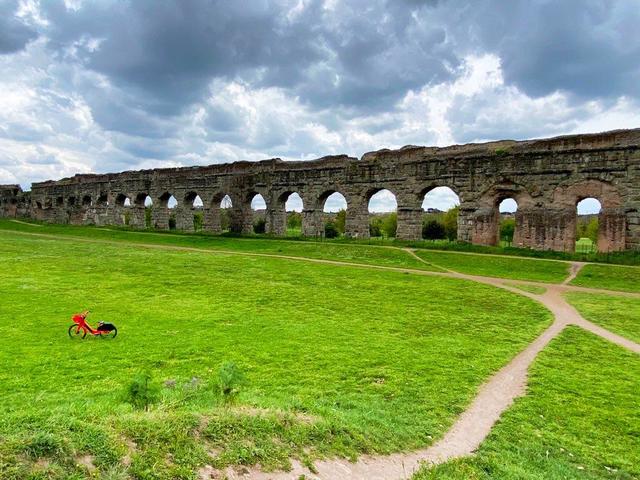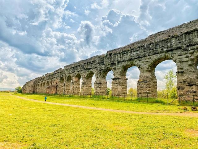 ↑ こちらがローマ水道のひとつ「クラウディア水道」です。美しい形の水道橋を体いっぱいに感じながら、ジョギングをすることもできます。この近くの地域には、羊の群れがたまにいることもあり、田舎の景色が広がり、とても郊外に来てしまったのかと思って焦ってしまいますが、実はまだローマの地下鉄A線の運行区間内にあります。